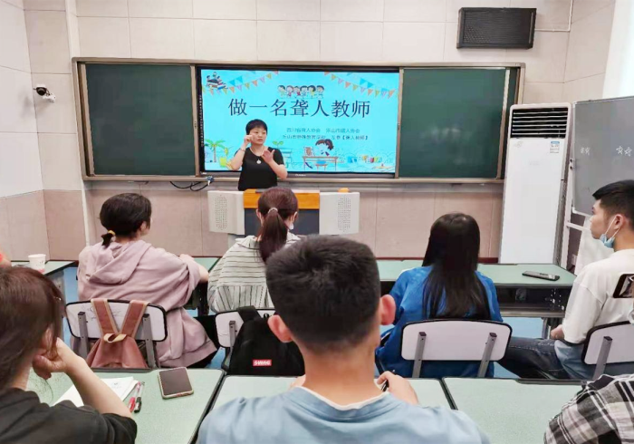 同学们聆听了全国特教园丁奖获得者、四川省聋协副主席、乐山特校聋人教师左春的专题讲座《做一名聋人教师》。左老师向大家介绍了她从教二十年的经历,围绕特殊教育的责任与使命、特校老师的基本要求、聋人教师的专业素养及备课、说课等同大家进行了分享交流。左老师学识渊博、经验丰富、幽默风趣,详细解答了同学们提出的“如何做一名聋人教师”等问题。左老师的讲座,让大家充分认识了特殊教育的重要意义,明确了要成为一名合格的聋人老师,在大学最后两年需要努力的方向的重点。