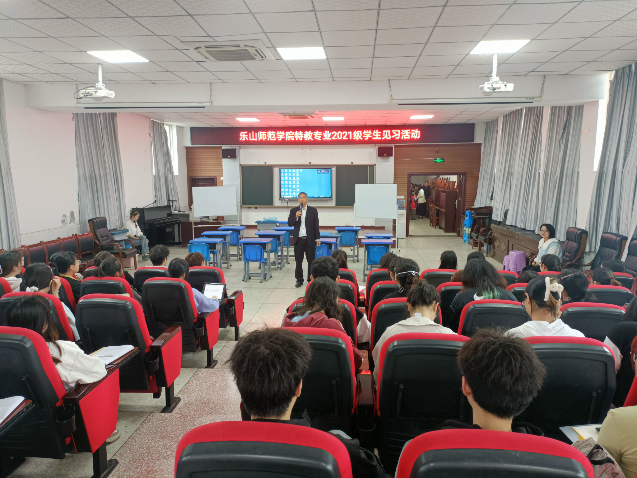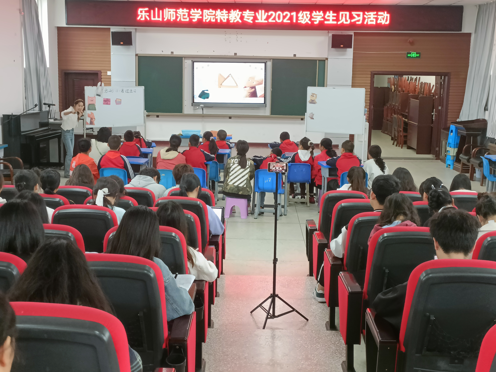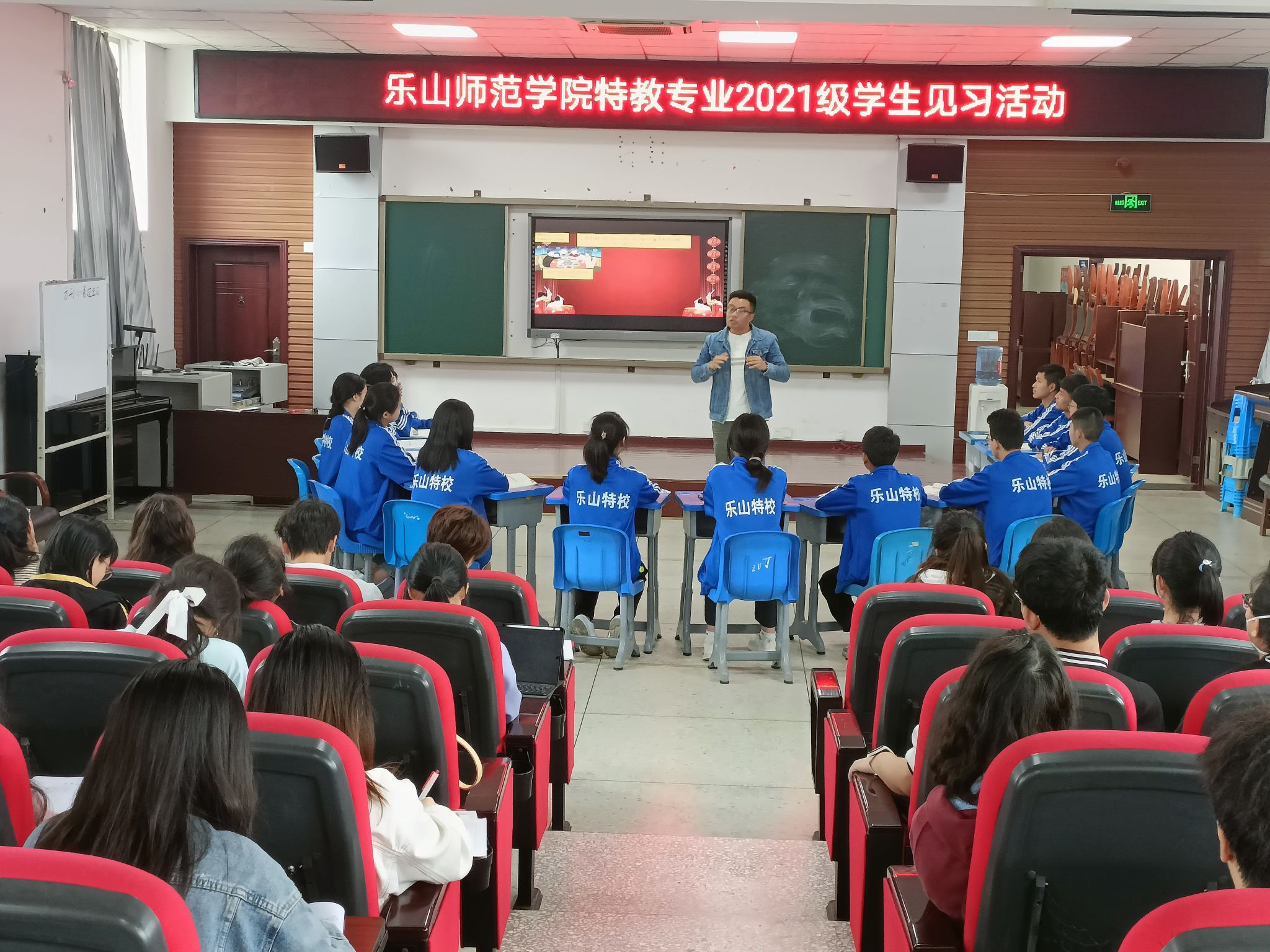 特校安排了优质课程观摩,在正式观摩之前,乐山特校周成燕校长表达了此次优质课程观摩活动的目的,以及做出了相关的期望和要求,他希望见习学生们能认真对待、有所收获,提升师范生技能。第一节课由赵琼老师给培智三年级学生上了一堂绘声绘色的绘本课——《方形小兔过生日》,任课教师生动形象的语言、环环相扣的教学环节、紧扣主题又丰富多样的教具极大地吸引了培智学生的注意力,很好地完成了课堂教学目标。第二节课由贺琳媚老师为培智七年级学生教授《如何写留言条》,从留言条的含义到如何写留言条,层层推进,环环相扣,每一步都浅显易懂。最后,一堂由夏五洋老师为听障高二年级学生讲授英语课《Spring Festival》,流利的英语、手语以及听障学生们的精彩互动,为我们展现了一堂三种语言的特殊课堂。