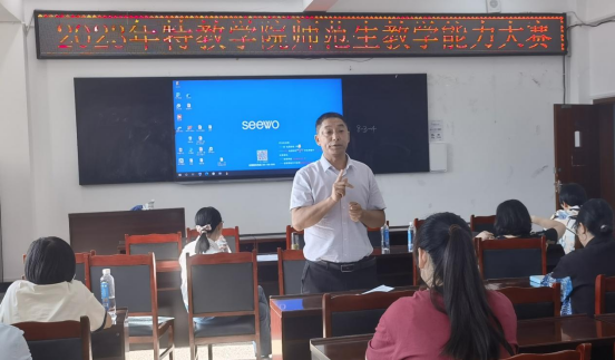 本网讯(文/图 胡瑞婷) 百年大计,教育为本,教育大计,教师为本。教师肩负着教书育人的神圣职责,是学生成长的教导者、引路人,为切实提升我院师范生教学水平和基本技能,6月8日下午,在特教大楼A栋406举行了2020级师范生教学能力大赛。本次大赛特邀乐山市特殊教育学校校长周成燕、攀枝花市特殊教育学校副校长姜小梅、betway西汉姆联教学法教师廖娅辉和王朝君以及我院教授余菊芬担任本次比赛的评委。