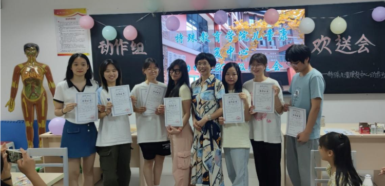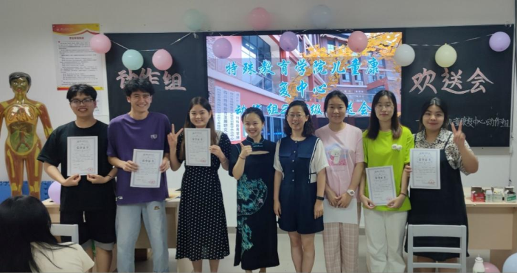 本网讯(文 图/涂鸿波) 6月13日晚上,特殊需要儿童教育康复中心动作组在特教大楼D栋404室,举行了离开动作组即将走上实习岗位的2020级学生欢送会,小组指导教师余菊芬、魏欣、向方桃、管芳和动作组全体学生参加。