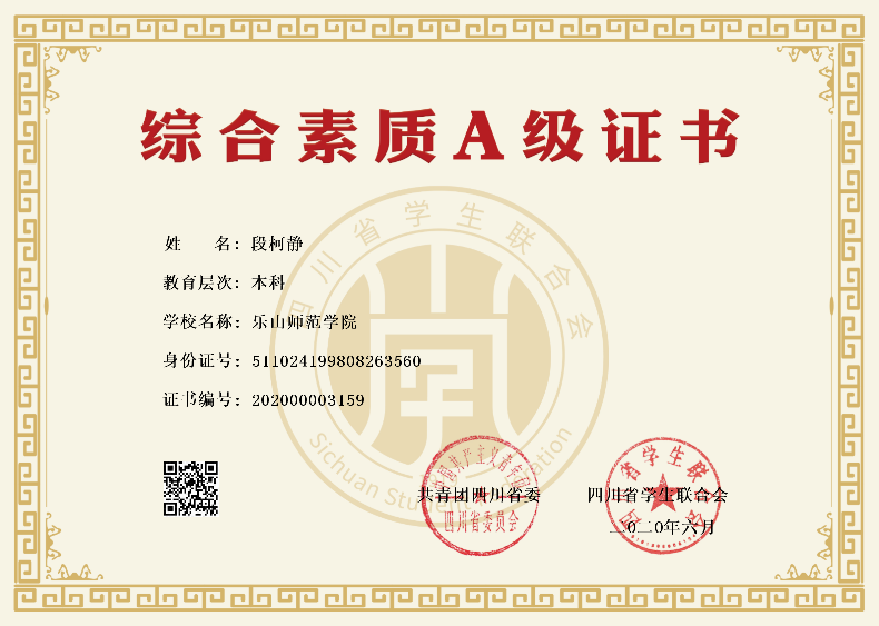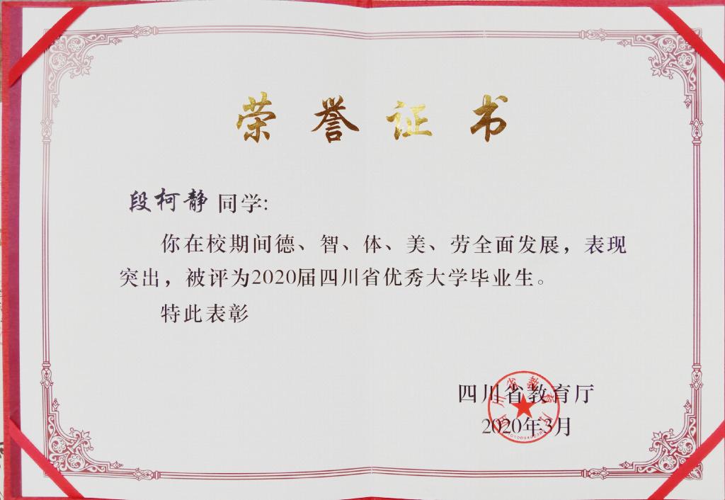 作为大学生,她认为最基本的便是学习。于是,在学习上一直严格要求自己,努力投入到各门基础课和专业课的学习中,给自己明确学习目标并端正学习态度,脚踏实地,经过不懈的努力和同学以及老师的帮助,功夫不负有心人,连续三年获得国家励志奖学金和校设奖学金,并顺利通过了计算机、英语和普通话等级考试、教师资格证考试。 除此,作为项目负责人积极申报2019年大学生创业创业项目并顺利结题;作为项目负责人积极申报2018年四川省“挑战杯”项目并获奖,参赛作品从确定选题,到实地调研,再到数据整理撰写调研报告花了八个多月的时间,中途经过了各种筛选,经历了立项、初期检查、中期检查、终期检查、省上终选等多个环节,于2019年获第十五届挑战杯四川省大学生课外学术科技作品竞赛省二等奖,校内一等奖。