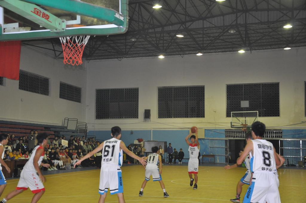 比赛开始,我院首先采用试探战术,基本了解对手战斗力后,改变战术,更换队员,12号王梓阳以其闪电般的速度和超强的控球力接连进球,但对手也毫不示弱,第一局结束,比分为14:12。在第二局中,我院优势并不明显,球员体力下降,但这并不影响20号球员胿世鹏与队友默契配合,以及6号球员赵云松不惧对手,奋力抢球的拼搏精神,第二局比分变为25:23。休息过程中,拉拉队员热情舞蹈,为球员们加油打气。中场和第三局比赛中,表现尤其突出的是28号刘丹,她充分发挥身高优势,使对手毫无招架之力,同时凭借精准投球实力,使比分拉开。第四局比赛以比分45:38开始,局势紧张起来,我院分数随时可能被反超。全场观众激动呐喊,鼓掌助威。倒数3分钟,我院被反超,12号球员远投三分,拉近比分。倒数30秒,比分为50:51,我院落后。但球员们无惧压力,战胜压力,12号球员在最后的12秒内罚球进篮,将比分追为53:51,我院获胜。