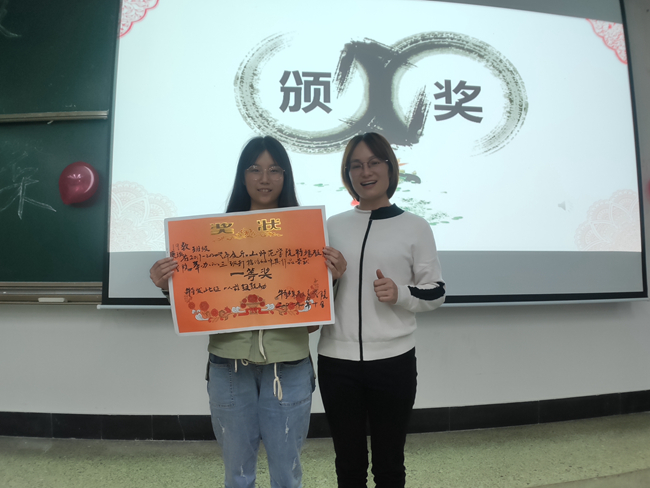 活动开始,主持人讲解比赛规则并介绍到场来宾。接着各班参赛代表按抽签顺序依次上台对“班徽、班规、班训”进行了讲解,通过图片、视频、绘画手册等多种形式展示了各自班级的独特风貌,给观众留下了深刻印象。其中,特教一班结尾的说唱才艺表演,使讲解变得生动有趣,活跃了现场的气氛。活动中场休息时还开展了“猜手语”游戏环节,在场的同学们热情参与游戏,让每一位同学都感受到参加团学活动的乐趣。比赛最后,评委严格评选出获奖班级,获得一等奖的是教康班,二等奖的是特教1班、艺术设计1班,三等奖的是艺术设计2班、特教二班、服装设计班、特教3班。并由李红老师、学生分会主席李科、分团委副书记杨潇为获奖班级颁奖并合影留念。