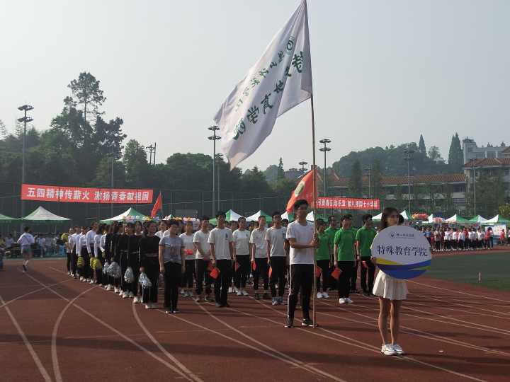 各学院组成的迈着整齐的步伐依次入场,特教学院方队由学生科长兰芳带队,方队迈着整齐划一的步伐向主席台迎面走来,啦啦队率先带来的开场舞动作潇洒,舞姿利落,随着音乐层层推进,点燃观众一波接一波的热情。紧随着的口号声在步伐的前进下更加响亮。他们向大家展现了特教学子特有的朝气、自信与热情。