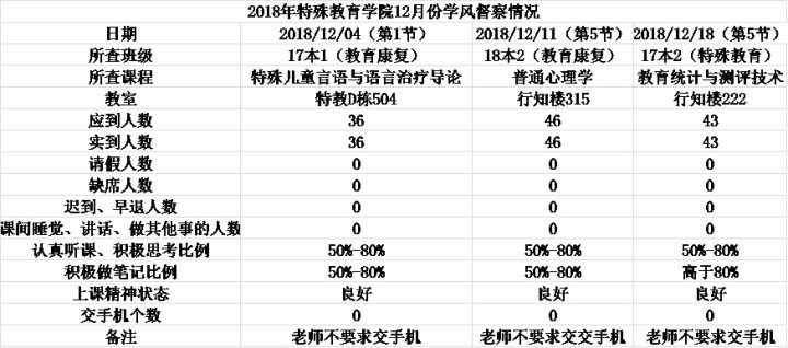 本月三次抽查的班级分别为17教康一班、17特教二班和18教康二班。根据本月查课记录及统计显示,所查班级出勤情况优,无缺席、旷课、迟到或早退人员。上课氛围良好,认真听课和积极做笔记学生比例皆在50%-80%之间,没有上课中玩手机或做其他事的同学,积极思考者比例在50%-80%之间,个别班能达到80%以上,同学们上课精神状态良好。