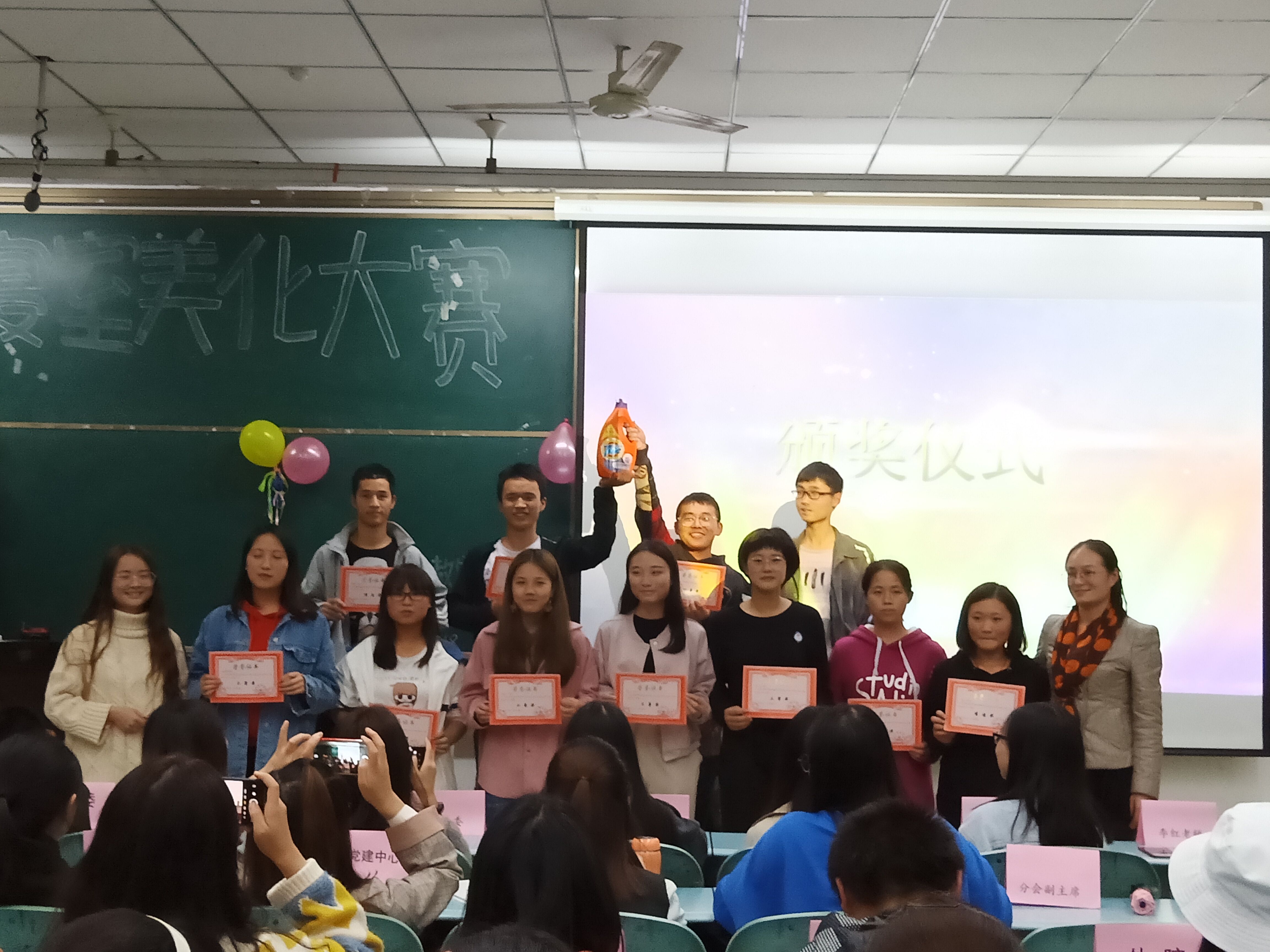 本次大赛主要分为三个环节:第一个环节各寝室进行PPT展示和才艺表演。各寝室特色突出,风格各异,寝室成员多才多艺,表演形式多样;第二个环节由评委打分进行评选。在此大赛中还穿插了有奖竞猜的环节,同学们都积极参与其中。最后是寝室美化大赛的颁奖环节,分团委书记李红、分会主席段柯静、15级张浩东给获奖寝室颁发奖状和奖品。活动结束后各评委与获奖寝室成员合影留念。