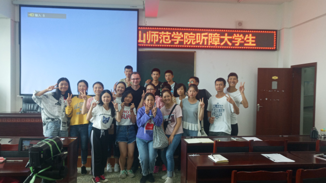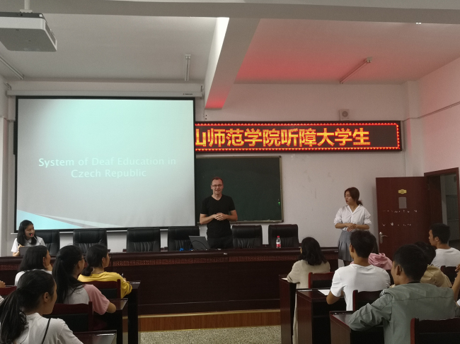 借助2016年度高端外国专家项目(文教类),19日上午9:00,捷克帕拉茨基大学学术委员会主席Langer教授与特教学院2018级本科听障大学生,在特教大楼A幢406开展学术交流。Langer教授首先用捷克手语介绍了捷克听障大学生所开设的教育课程,针对听力障碍学生所采用的教学方法(口语教学、口语+手语教学、综合各种沟通方式的教学等),让我院听障大学生比较详细的了解了捷克听障大学生的学习和生活状态,拓宽了他们的国际视野。接着,Langer教授重点介绍了“扩大替代沟通系统(AAC)—MAKATON”。他强调这个系统是一个综合运用图片、符号以及口语等多感官进行沟通的系统,用来帮助有沟通障碍的人群进行沟通交流,重点讲解MAKATONDE所包含的沟通词语、符号、使用范围等,使我们对障碍学生的沟通方式有了更多得思考。最后,在提问环节,听障大学生们积极提出问题,通过手语与Langer教授交流,对捷克手语与中国手语的差异颇感兴趣,也充分认识到听障大学生可以有多种途径学习,可以获得更多的知识,提高社会适应能力。