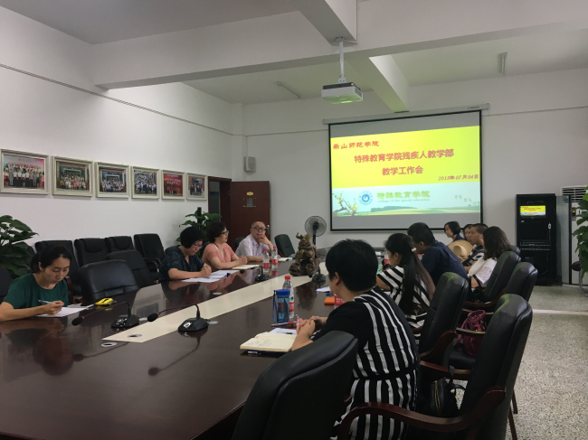特教学院继2017年首届招收10名听障本科大学生后,2018年9月将迎来2018级听障本科大学生20名和2018级听障五年一贯制专科(艺术设计专业)大学生49名学生。为做好下学期本、专科听障大学生的教学工作,7月4日下午2:30至5:30,特教学院残疾人教学部组织听障教学任课教师在特教大楼A408会议室召开听障教学研讨会。特教学院执行院长汪红烨参加本次会议,会议由特教学院副院长张梅主持。